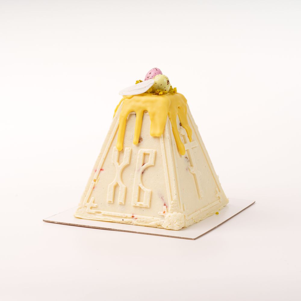 Нежная пасха из творога и заварного крема с добавлением изюма и вяленной вишни. В качестве декора используются шоколадные яйца с ореховой начинкой