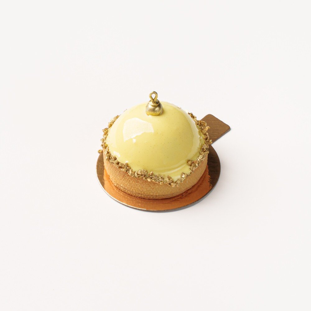 Хрустящее сабле с начинкой из яркого малинового конфи и нежного кокосового мусса. Выполнено в праздничном новогоднем оформлении в виде жёлтого ёлочного шарика.